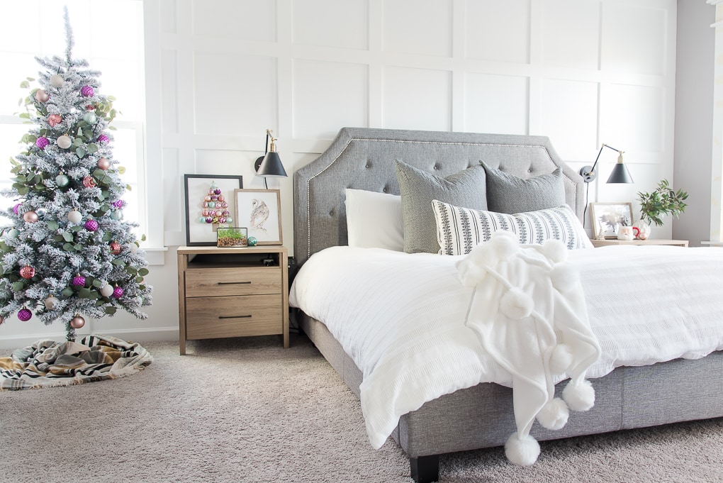 Oh my goodness, your room is so cozy! The pops of pink, the beautiful board and batten wall, the flocked tree, and the pom pom blanket. It’s all so beautiful! Puts my bedroom to shame, lol. 🙂