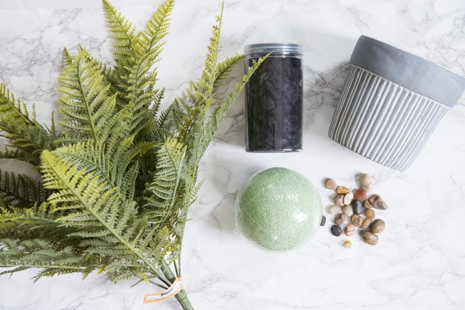 Because we’re working with fake plants, we won’t be using any soil. That also means that there’s nothing weighing the planter down. And since the fern greenery stem we’re using is fairly large, you’ll want to make sure your arrangement doesn’t topple over.