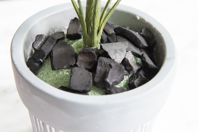 I decided to use a matte black vase filler. I’m not exactly sure what material this was, but the pieces seemed like burned mulch chips. They had an ashy texture to them and the black color came off on my hands.