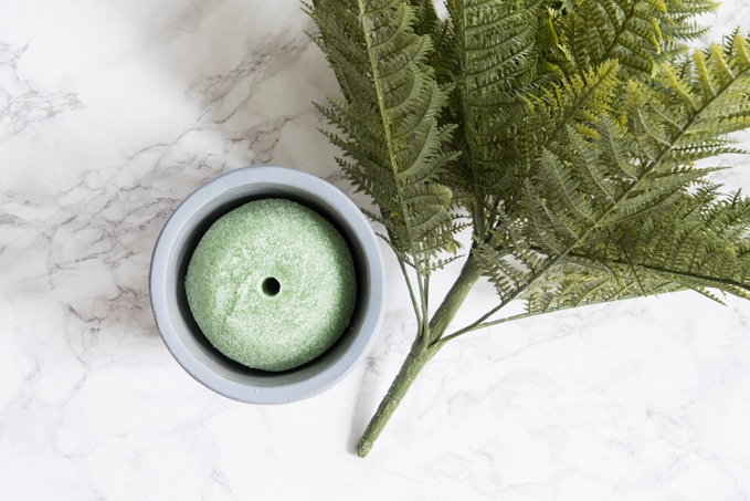 Now, it’s time to add the fern stem. Take your faux fern greenery stem and push it straight into the styrofoam. Make sure that as you’re pushing the stem into the styrofoam that you’re keeping it upright and straight.
