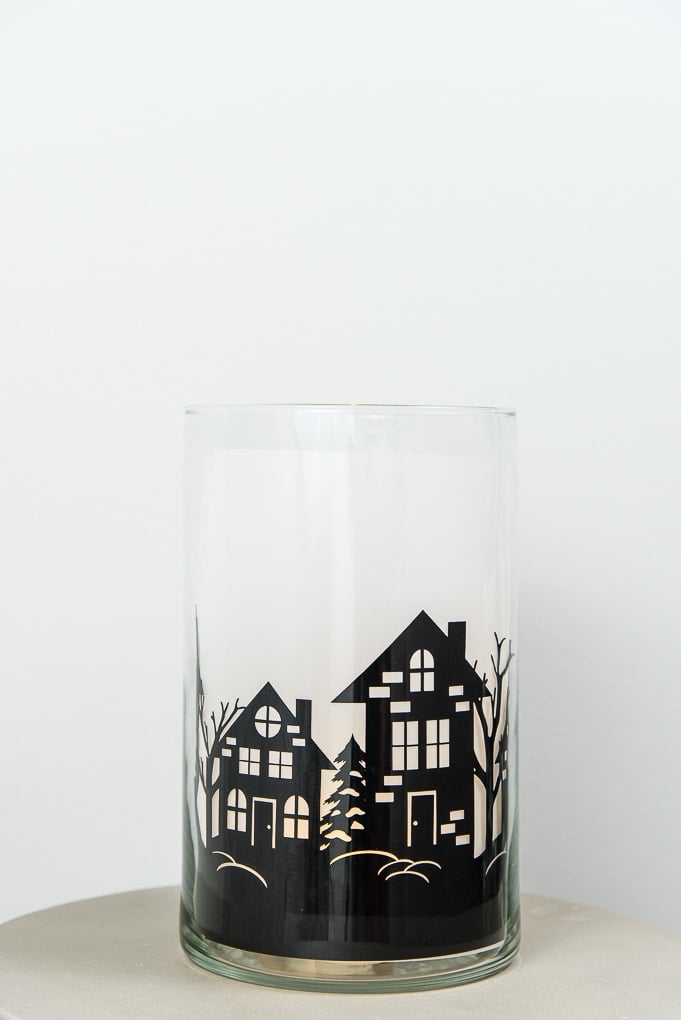 Craft a holiday-themed hurricane vase using your Cricut to cut out a winter scene. Place a candle inside for a cozy glow.