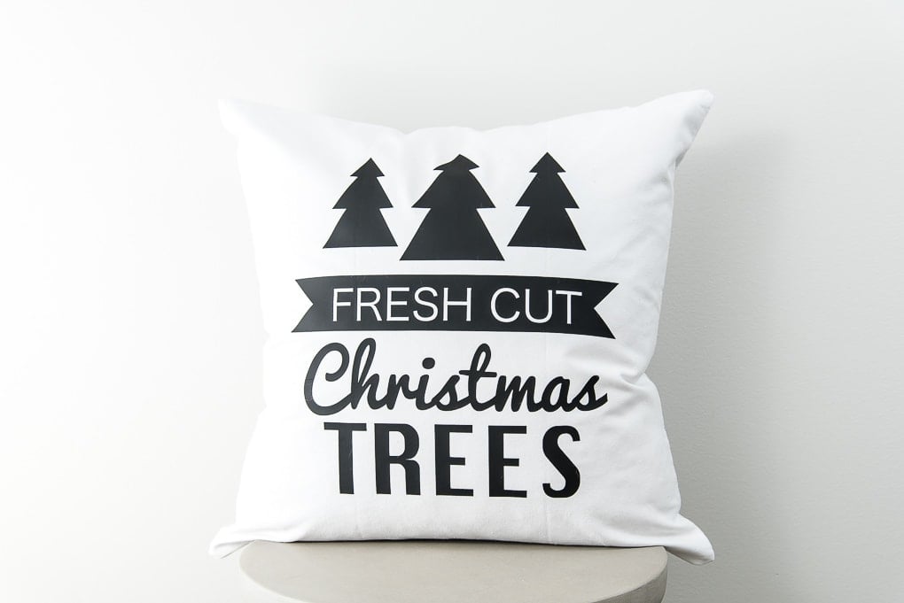 Cut out tree shapes and letters from iron on vinyl using your Cricut. Then, adhere them to a plain pillow cover using a Cricut EasyPress.