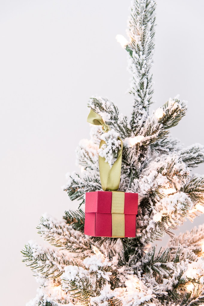 Cut out box shapes using your Cricut, assemble them, and add a small gift or treat inside before hanging on the tree.
