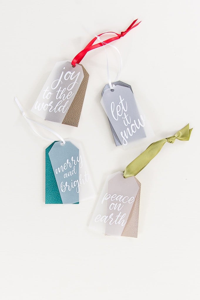 Cut out layered tag shapes and festive phrases with your Cricut. Assemble to create beautiful Christmas gift tags.