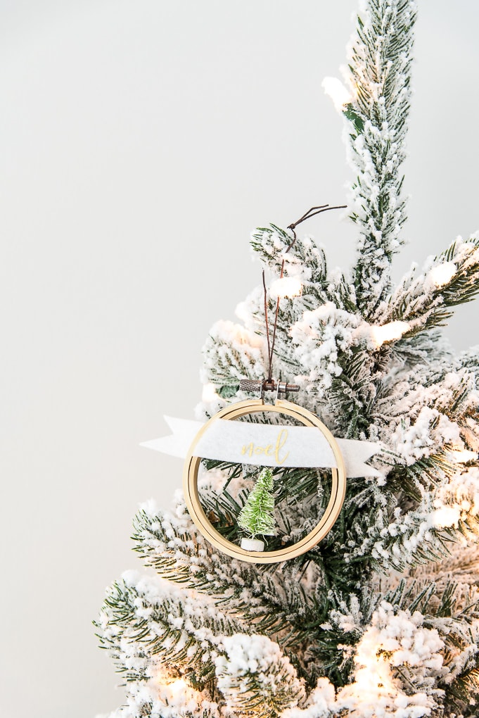 Create a beautiful Noel embroidery hoop ornament to hang on your tree.