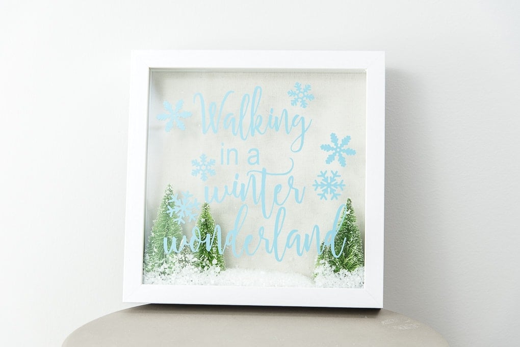 Cut out winter scene shapes with your Cricut, placing them in a shadow box with artificial snow for a charming display.