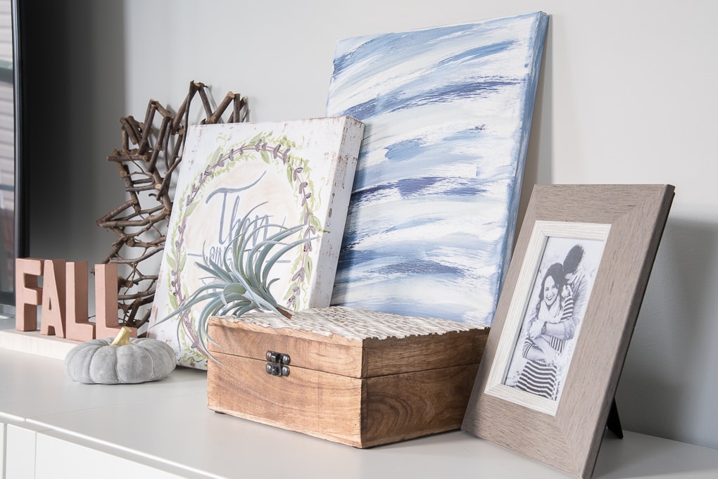 I really wanted an abstract canvas for the media center decor but couldn’t find one that I thought would fit well. So, I decided to paint this one myself! I actually really love how it turned out and it was super budget friendly.