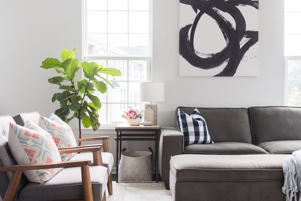 So, let me give you a tour of our simple and modern fall home. We’ll start in the living room.