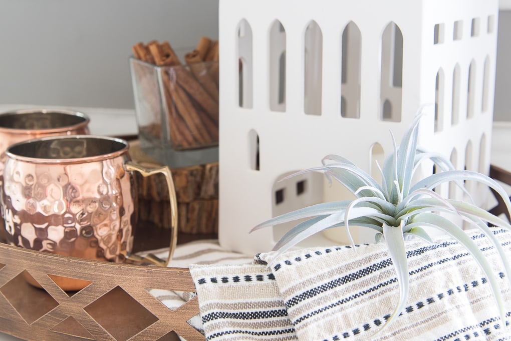 On the other side of my kitchen counter, I set up a small apple cider station. I gathered a few supplies and decorations and corralled them in this pretty metallic tray.